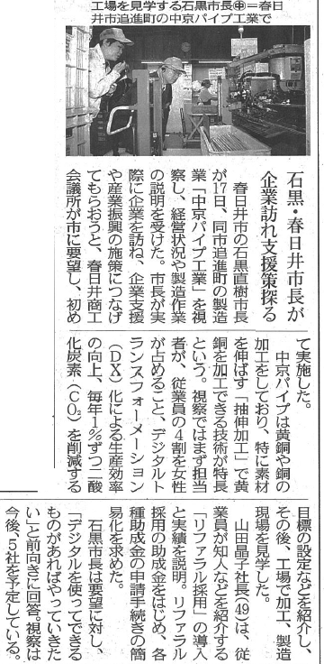 中部経済新聞 地域経済面 「市内企業視察」に掲載