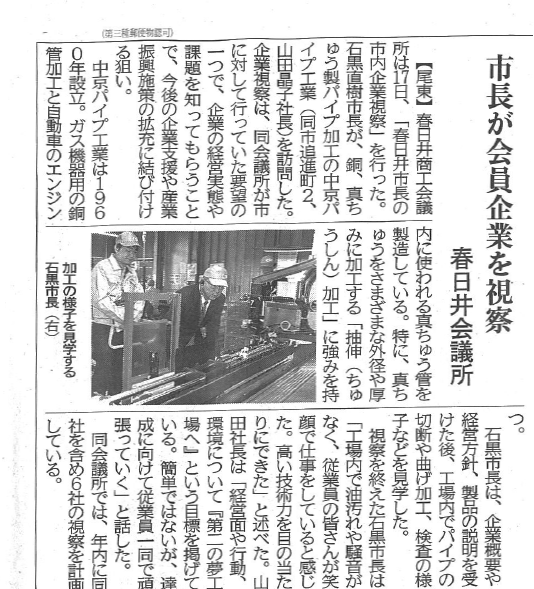 中部経済新聞 地域経済面 「市内企業視察」に掲載
