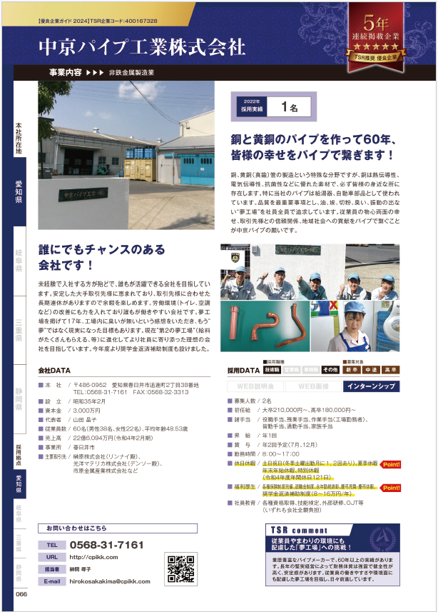 東京商工リサーチ「ALEVEL優良企業ガイド2024 東海4県版」に5年連続で掲載いただきました。