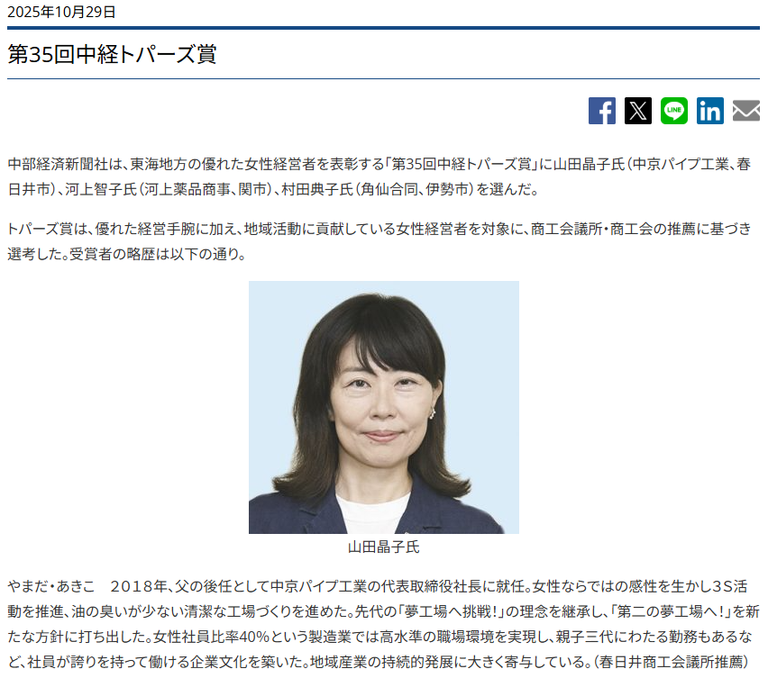 中部経済新聞(ネット版) 第35回中経トパーズ賞に掲載されました。