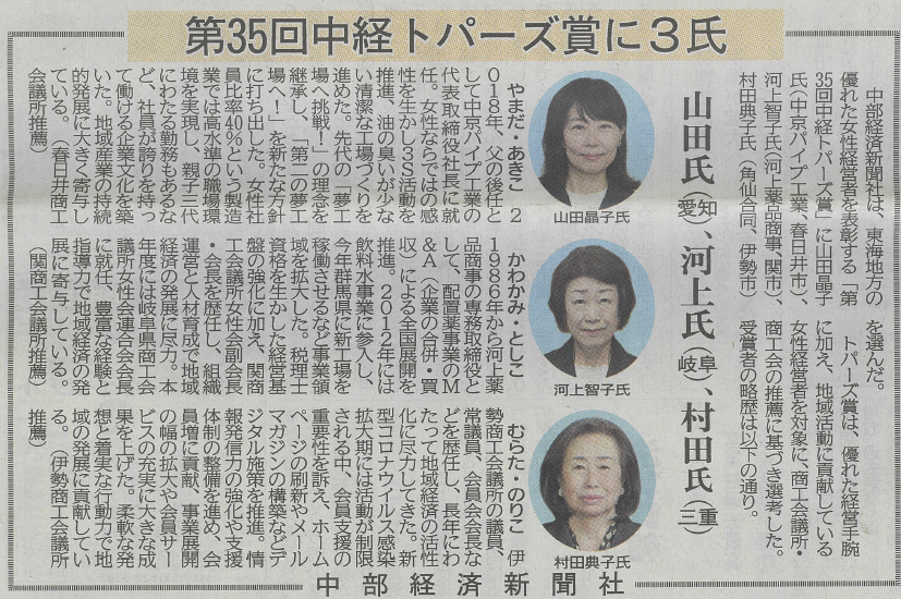 中部経済新聞「第35回中経トパーズ賞に3氏」に掲載