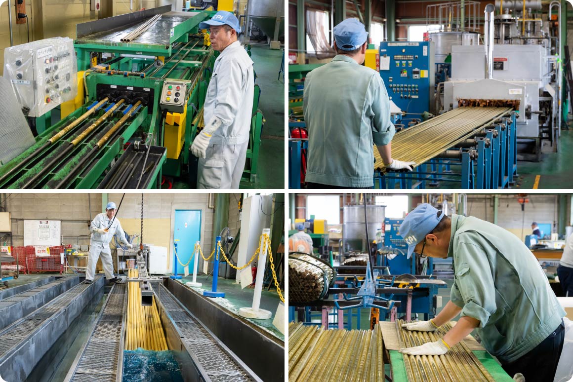 自動車部品向けに、真鍮管の「抽伸加工」を行います。「抽伸加工」は、金属材料を専用の穴(ダイス)を通して引き伸ばし、管や棒などの形状と寸法を形成する独特な加工方法です。この技術により、高精度かつ安定した品質が実現。お客様との厚い信頼関係につながっています。